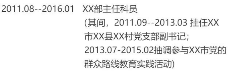 (五)临时离开工作单位连续半年以上及到基层挂职锻炼的,也应在本段简历中加以注明。工作单位和职务要写比较规范的简称。