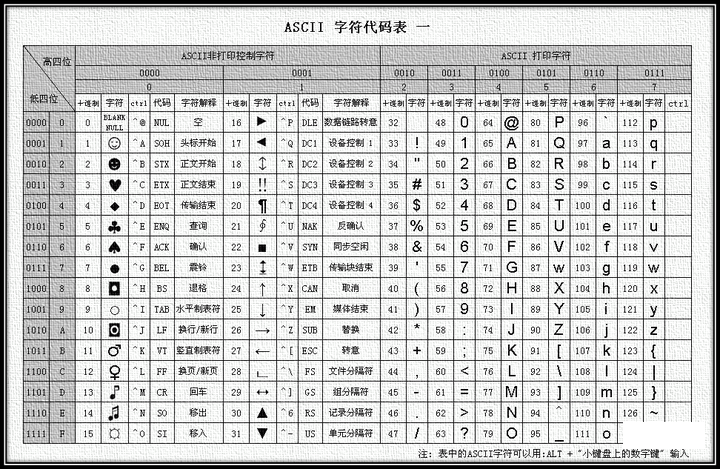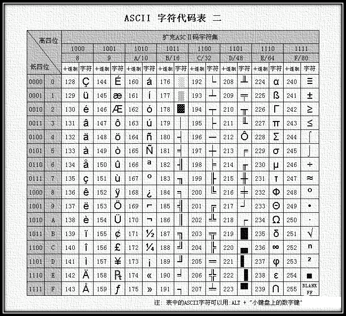 认真的小伙伴可能会发现仿宋_GB2312、方正仿宋_GBK又有点不一样,后面分别带了个GB2312和GBK。这里又涉及到了字符集和字符编码的知识。学过计算机基础知识的小伙伴应该对ASICII还保留一些印象。ASCII(American Standard Code for Information Interchange,美国信息交换标准代码)是基于拉丁字母的一套电脑编码系统。它主要用于显示现代英语,而其扩展版本EASCII则可以勉强显示其他西欧语言。ASCII字符集:主要包括控制字符(回车键、退格、换行键等),可显示字符(英文大小写字符、阿拉伯数字和西文符号)。ASCII编码:将ASCII字符集转换为计算机可以接受的数字系统的数的规则。使用7位(bits)表示一个字符,共128字符;但是7位编码的字符集只能支持128个字符,为了表示更多的欧洲常用字符对ASCII进行了扩展,ASCII扩展字符集使用8位(bits)表示一个字符,共256字符。ASCII字符集映射到数字编码规则如下图所示:
