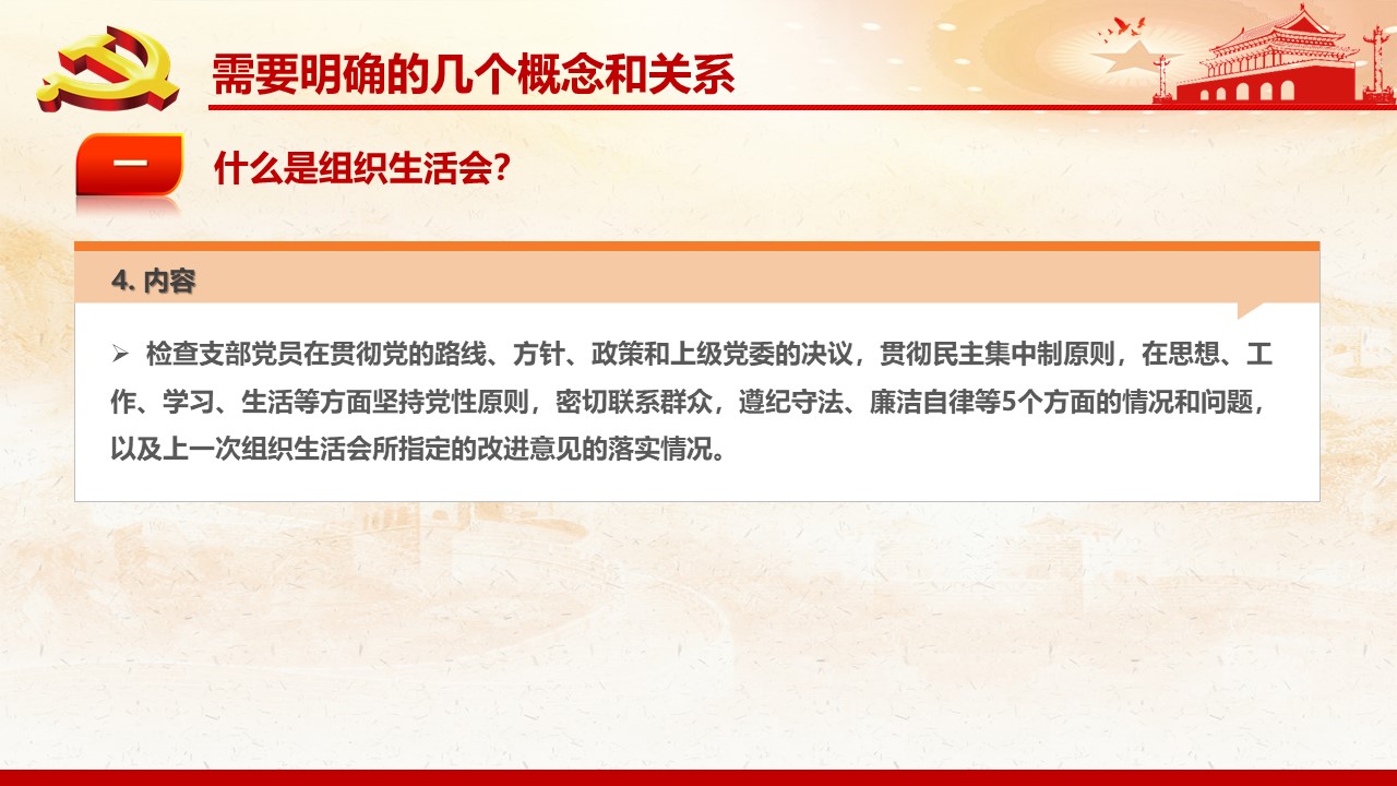 4.内容:检查支部党员在贯彻党的路线、方针、政策和上级党委的决议,贯彻民主集中制原则,在思想、工作、学习、生活等方面坚持党性原则,密切联系群众,遵纪守法、廉洁自律等5个方面的情况和问题,以及上一次组织生活会所指定的改进意见的落实情况。