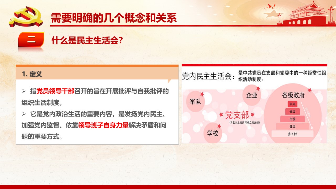 1.定义:指党员领导干部召开的旨在开展批评与自我批评的组织生活制度。它是党内政治生活的重要内容,是发扬党内民主、加强党内监督、依靠领导班子自身力量解决矛盾和问题的重要方式。