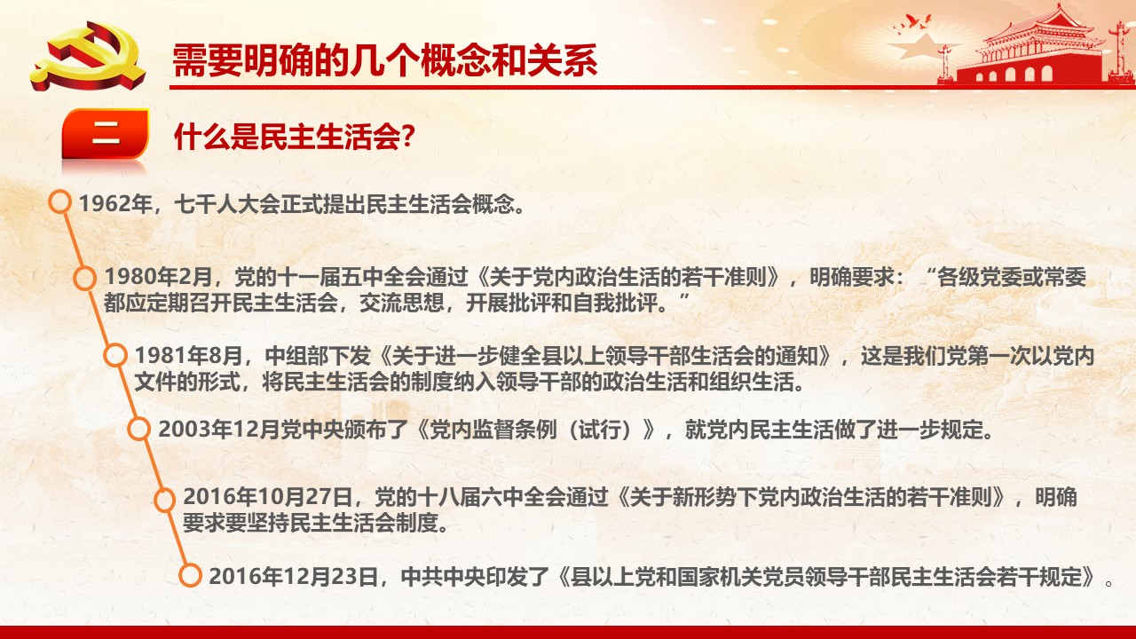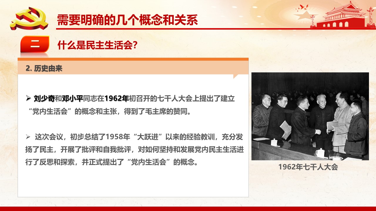 2.历史由来:刘少奇和邓小平同志在1962年初召开的七千人大会上提出了建立“党内生活会”的概念和主张,得到了毛主席的赞同。这次会议,初步总结了1958年“大跃进”以来的经验教训,充分发扬了民主,开展了批评和自我批评,对如何坚持和发展党内民主生活进行了反思和探索,并正式提出了“党内生活会”的概念。