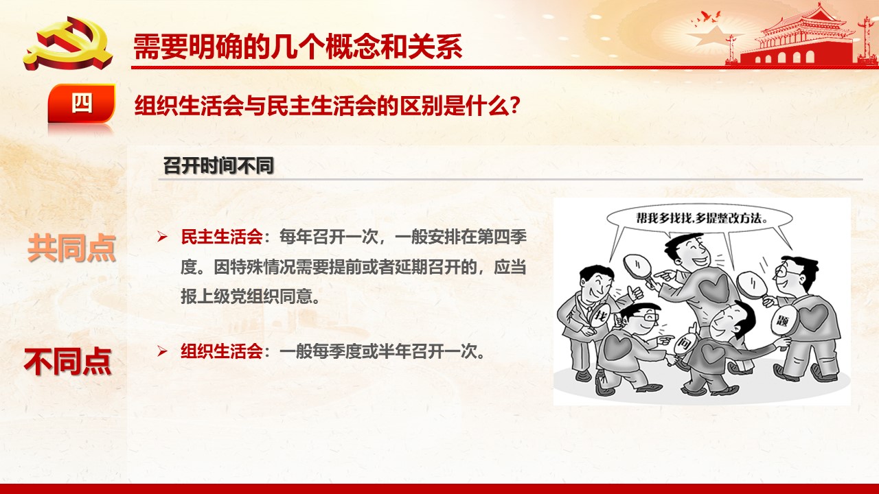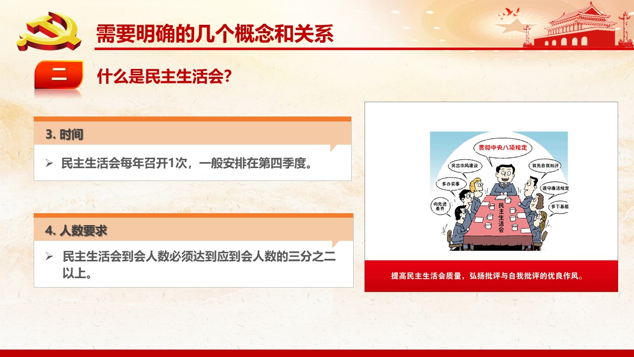 3.时间:民主生活会每年召开1次,一般安排在第四季度。