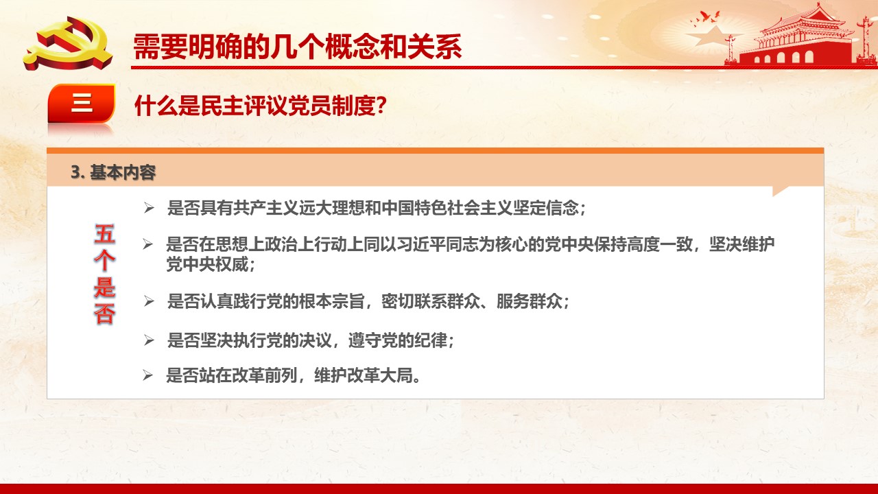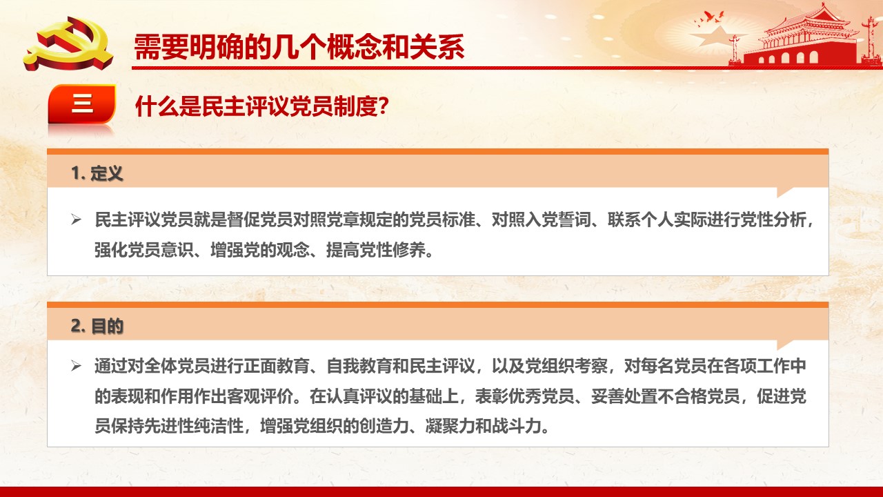 1.定义:民主评议党员就是督促党员对照党章规定的党员标准、对照入党誓词、联系个人实际进行党性分析,强化党员意识、增强党的观念、提高党性修养。