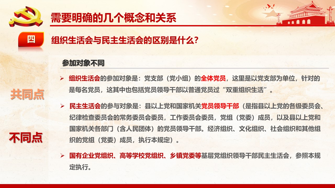 按照规定,县以上党和国家机关党员领导干部要参加民主生活会,国有企业党组织、高等学校党组织、乡镇党委等基层党组织领导干部按照民主生活会参照执行。这里民主生活会的召开范围就没有涉及村、社区这一层级的基层党委或党总支,而组织生活会又是要求以党支部为单位组织开展。