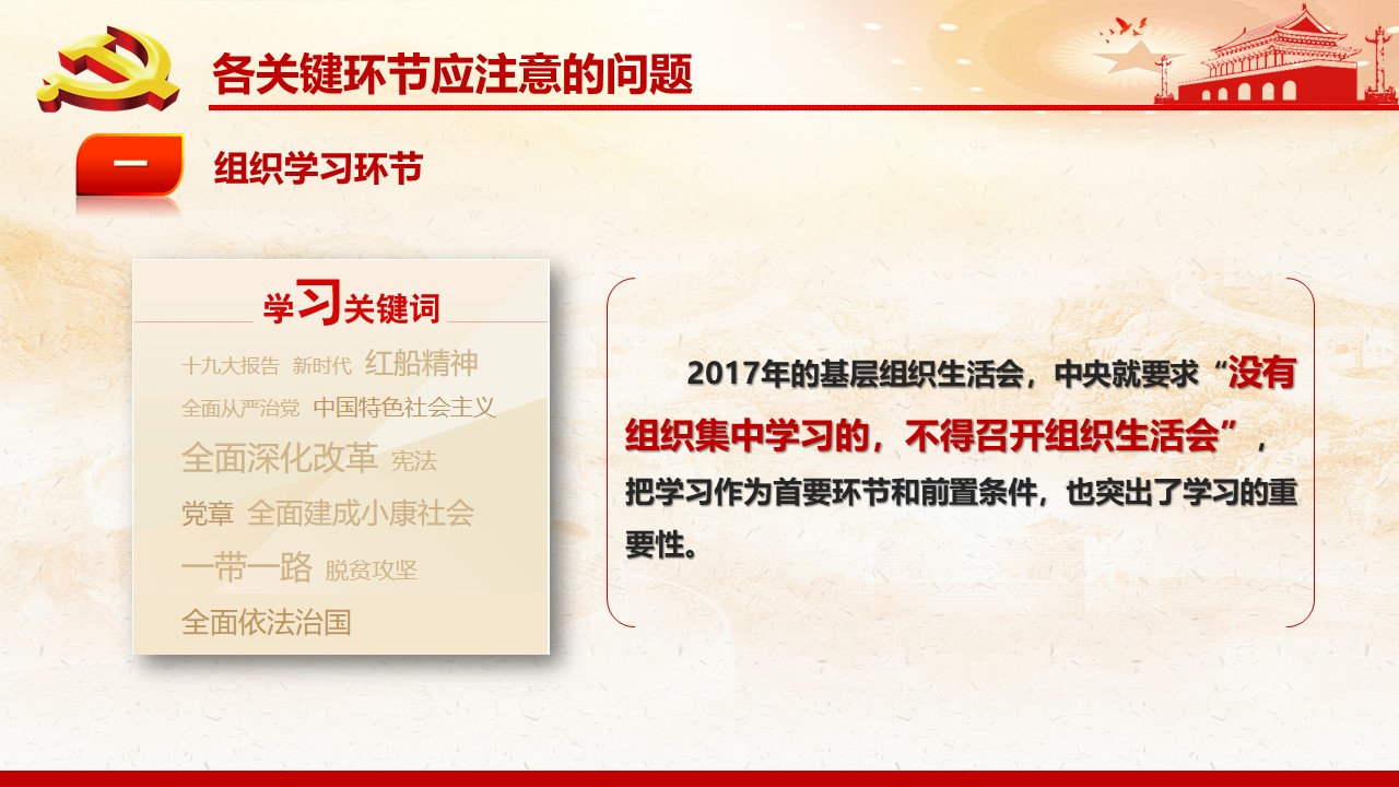 2017年的基层组织生活会,中央就要求“没有组织集中学习的,不得召开组织生活会”,把学习作为首要环节和前置条件,也突出了学习的重要性。
