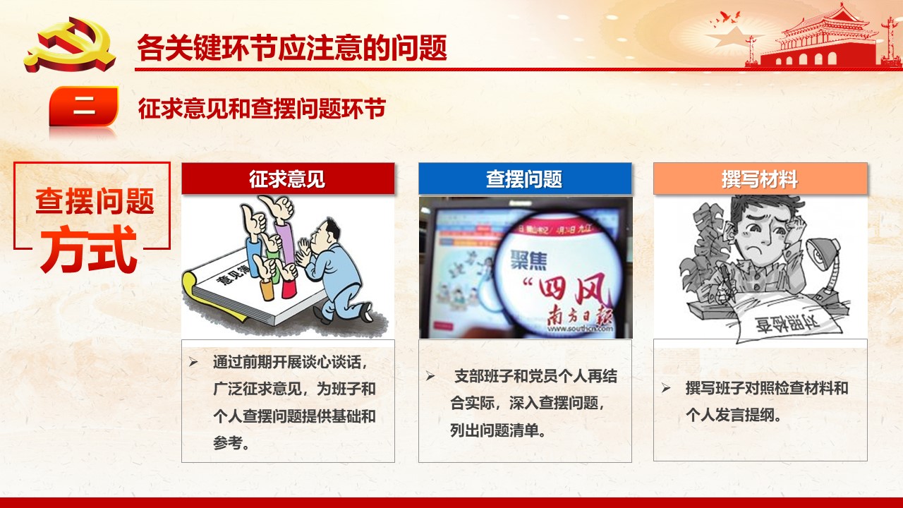 会前:1.组织学习;2.谈心谈话(征求意见);3.查摆问题(撰写发言)。