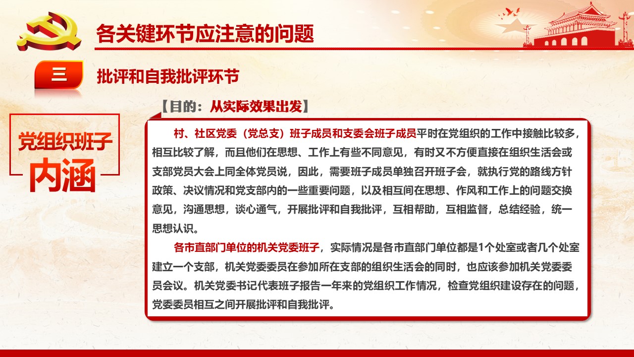 村、社区党委(党总支)班子成员和支委会班子成员平时在党组织的工作中接触比较多,相互比较了解,而且他们在思想、工作上有些不同意见,有时又不方便直接在组织生活会或支部党员大会上同全体党员说,因此,需要班子成员单独召开班子会,就执行党的路线方针政策、决议情况和党支部内的一些重要问题,以及相互间在思想、作风和工作上的问题交换意见,沟通思想,谈心通气,开展批评和自我批评,互相帮助,互相监督,总结经验,统一思想认识。