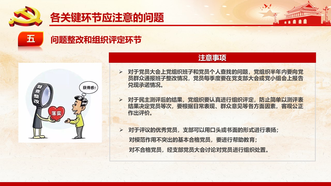 注意事项:对于党员大会上党组织班子和党员个人查找的问题,党组织半年内要向党员群众通报班子整改情况,党员每季度要在党支部大会或党小组会上报告兑现承诺情况。对于民主测评后的结果,党组织要认真进行组织评定,防止简单以测评表结果决定党员等次,要根据日常表现、群众意见等各方面因素,客观公正作出评价。对于评议的优秀党员,支部可以用口头或书面的形式进行表扬;对模范作用不突出的基本合格党员,要进行帮助教育;对不合格党员,经支部党员大会讨论对党员进行组织处置。
