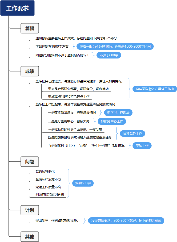 每年的要求是不一样的,每个地方的要求也不一样,吃透要求才能把握重点,不漏要点。上级的要求,一般都在下发的通知里,对述职内容、报告结构、篇幅长短等都有详细的要求,一定要认真研读。